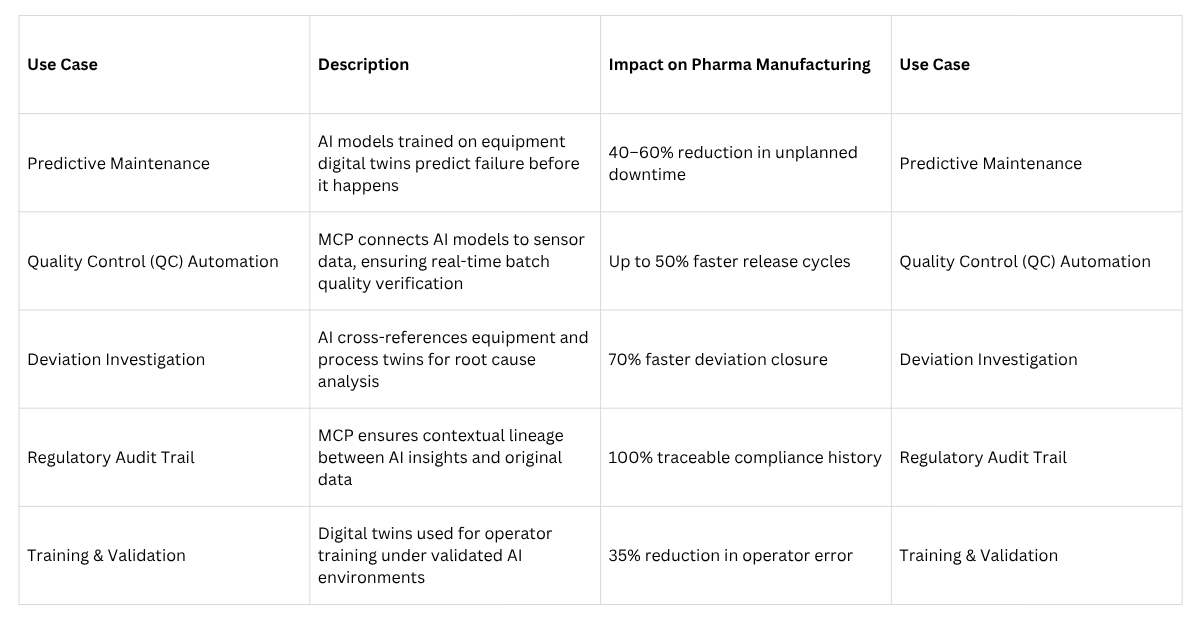 Now, let’s drill down on how MCP specifically contributes to integrating AI with digital twins for predictive maintenance and quality control in pharma / life sciences. I break this into several themes: