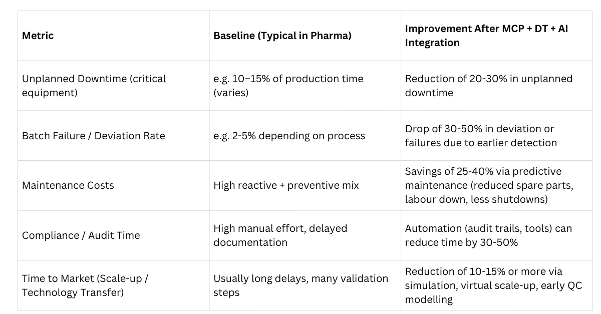 To help understand what kind of improvements are realistic, here are sample metrics and expected gains from digital twin + AI + MCP integration, based on industry data + extrapolation: